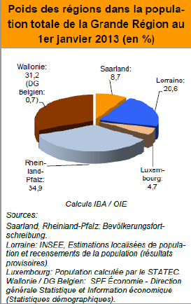 Au 1er janvier 2013, la Grande Région compte 11,4 millions d’habitants, soit 2,3 % de la population de l’Union européenne (UE des 28).
