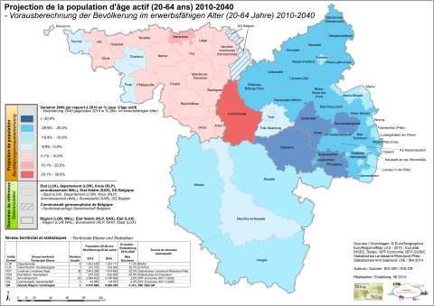 Au niveau de l’ensemble de la Grande Région on constate la même tendance qu’en Lorraine, à savoir une croissance de la population totale (+ 1,2%) et un déclin de la population d’âge actif (-11,0%).