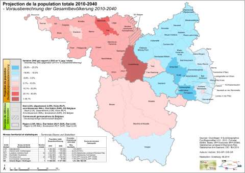 Selon les projections du STATEC (2010, scénario « baseline », élaboré par les experts d’EUROSTAT), le Luxembourg continuerait à occuper une position à part dans la Grande Région en termes de croissance démographique. Sur la base d’un taux de fécondité relativement élevé et croissant (moyenne 2001-2009 : 1,63 enfants par femme ; 1,72 en 2060) et d’une immigration persistante, la population totale serait appelée à augmenter de 40,2% jusqu’à l’horizon 2040. Le Grand-Duché dépasserait donc à terme le seuil des 700 000 habitants. Comme dans les autres entités de la Grande Région, la croissance démographique serait principalement due au groupe d’âge des 65 ans et plus. En effet, leur nombre ferait plus que doubler à l’horizon 2040. Tout comme pour les autres régions, la part de la population d’âge actif dans la population diminuerait entre 2010 et 2040, du fait d’une croissance nettement moins importante que celle de la population totale (20,7%). Dans ce contexte, il faut noter que les projections de population du Grand-Duché du Luxembourg varient énormément selon le scénario de migration retenu. Ainsi, plus le solde migratoire sera bas, plus l’accroissement de la population des 20 à 64 ans sera faible.