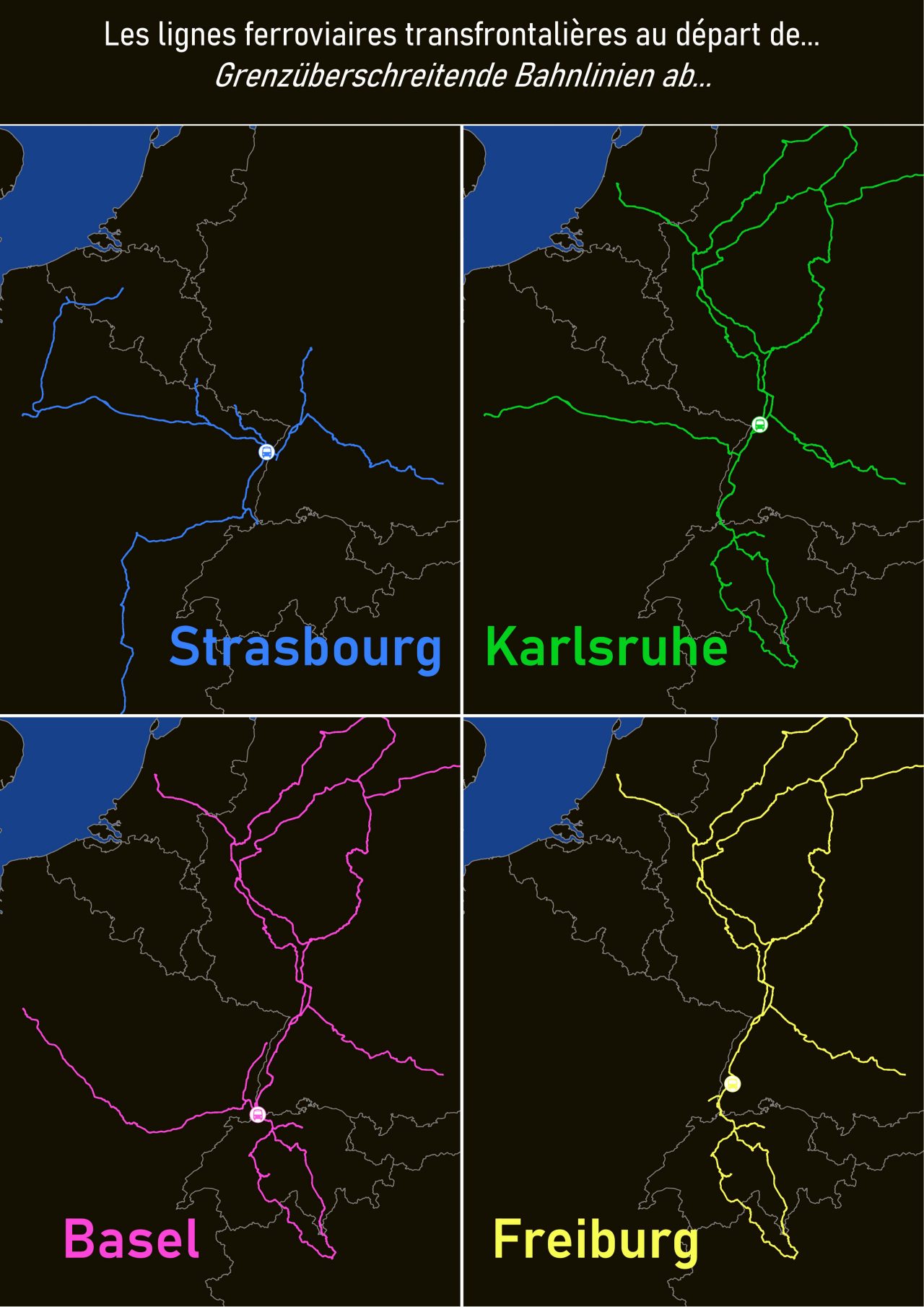Die Karte zu den grenzüberschreitenden Bahnlinien ab den Hauptbahnhöfen in der Großregion und dem Oberrhein ist das Ergebnis einer Zusammenarbeit zwischen dem GIS-GR und GeoRhena, dem GIS der Oberrheinkonferenz, das diese stilisierten Karten erstellt hat.
