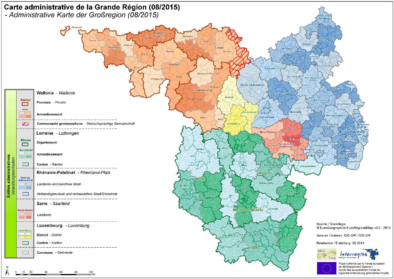 Die Karte stellt die administrativen Einheiten innerhalb der Großregion am 1. August 2015 dar.