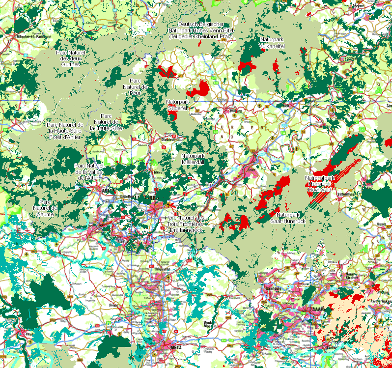 Derzeit gibt es 23 Naturparks, die fast ein Viertel der Fläche der Großregion einnehmen. Diese Strukturen konzentrieren sich im Zentrum der Großregion, wo eine Reihe von wald- und moorreichen Naturparks den Westen von Rheinland-Pfalz, den Norden Luxemburgs und den Osten und Süden Walloniens verbinden. Im deutschen Teil erstreckt sich der Naturpark Saar-Hunsrück vom Hunsrückwaldmassiv bis zu den Weinbergen von Saar und Mosel, auf beiden Seiten der Grenze zwischen Saar (44% der Fläche) und Rheinland-Pfalz. Im nordöstlichen Teil des Parks befindet sich der Nationalpark Hunsrück-Hochwald, der ebenfalls überregional und ausschließlich dem Naturschutz gewidmet ist. Der Naturpark Trois Frontières/Dräilännereck in Luxemburg, dessen Schaffung derzeit geplant ist, könnte dieses grenzüberschreitende Netzwerk bereichern.