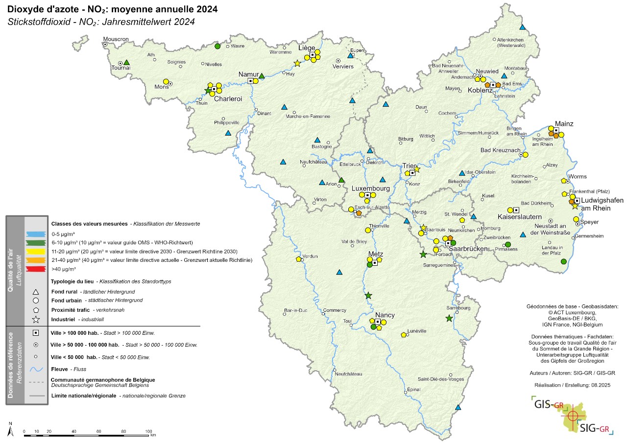 An 81 Standorten in der Großregion wird permanent die Stickstoffdioxidbelastung (NO2) erfasst. Die Jahresmittelwerte 2024 liegen zwischen 1 µg/m³ (Mikrogramm pro Kubikmeter) und 29 µg/m³.