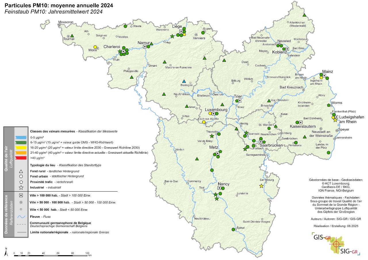 In Zusammenarbeit mit dem Geografischen Informationssystem der Großregion (GIS-GR) gibt die Gruppe hier einen Überblick über die Luftqualität in der Großregion im Jahr 2024. Grundlage sind die Daten und Analysen der 5 Netzwerke zur Überwachung der Luftqualität: Wallonische Luft- und Klimaagentur (Agence Wallonne de l‘Air et du Climat, AWAC), Umweltamt Luxemburg, Umweltministerium des Saarlandes, Landesamt für Umwelt Rheinland-Pfalz und ATMO Grand Est.