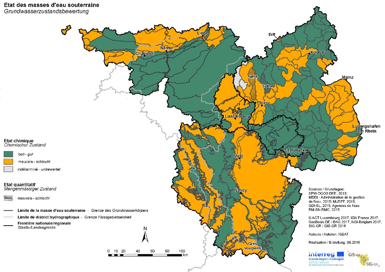 L’état quantitatif est satisfait pour la quasi-totalité des masses d’eau souterraine de la Grande Région. Seules quatre masses d’eau (trois en Rhénanie-Palatinat et une en Lorraine) n’atteignent pas le bon état, en raison principalement de prélèvements excessifs de la ressource en eau en saison estivale.