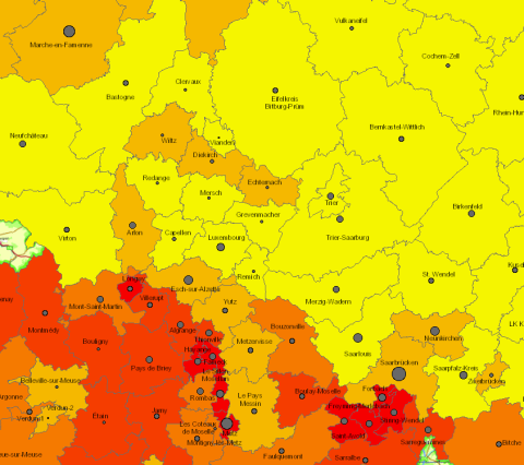 Les disparités au sein de chacun des territoires de la Grande Région sont toutefois moins marquées, même si les grandes villes (comme Metz, Nancy, Sarrebruck, Charleroi ou Ludwigshafen) tendent à présenter des taux plus forts que la moyenne régionale. Il peut s’agir des effets toujours vivaces de la désindustrialisation, comme le montrent les cas de Liège et Mons en Wallonie ou encore des bassins sidérurgiques et houillers en Lorraine (Val de Fensch et Val de Rosselle notamment). Dans cette dernière région, les espaces en périphérie des grands pôles d’emplois messin et nancéen connaissent une situation néanmoins plus favorable. Il est à noter que malgré le dynamisme de son économie, certains territoires du Grand-Duché ont des taux supérieurs à 7 % (cantons d’Esch-sur-Alzette, de Diekirch ou de Wiltz).